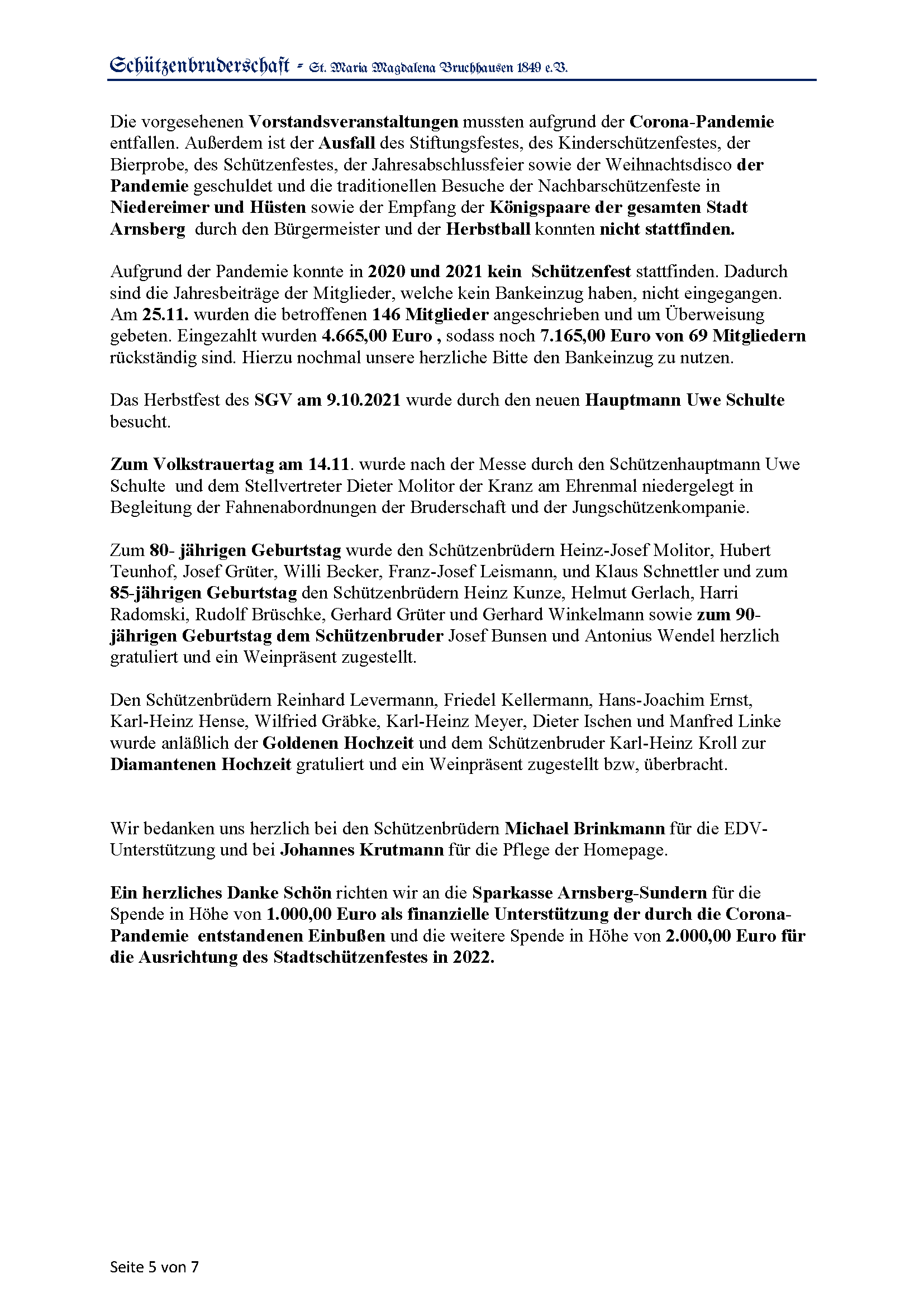 Geschäftsbericht 2021 der Schützenbruderschaft St. Maria Magdalena Bruchhausen vom 28.02.2022.