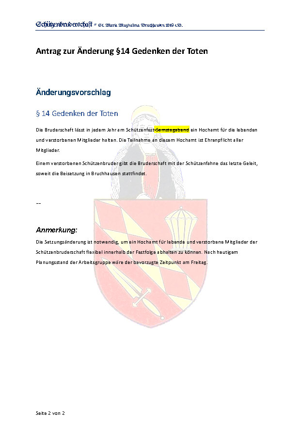 Die Satzungsänderung ist notwendig, um ein Hochamt für lebende und verstorbene Mitglieder der Schützenbruderschaft flexibel innerhalb der Festfolge abhalten zu können. Nach heutigem Planungsstand der Arbeitsgruppe wäre der bevorzugte Zeitpunkt am Freitag.