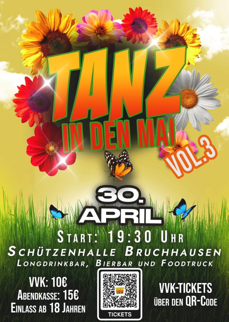 Am 30.04.2026 findet in der Schützenhalle Bruchhausen wieder der Tanz in den Mai statt.